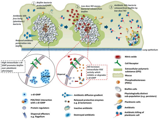 Disruption of biofilm antibiotic tolerance regulated by NO. (①) The formation of biofilms due to high concentration of c-di-GMP, which endowed bacteria antibiotic tolerance. (②)Biofilm dispersal regulated by low dose of NO, since NO reduce the intracellular levels of c-di-GMP. (③) Plankronic bacteria releasing from biofilm restore sensitivity to antibiotics and are killed by antibiotics. Reproduced with permission from [151]. Copyright 2017, Elsevier.