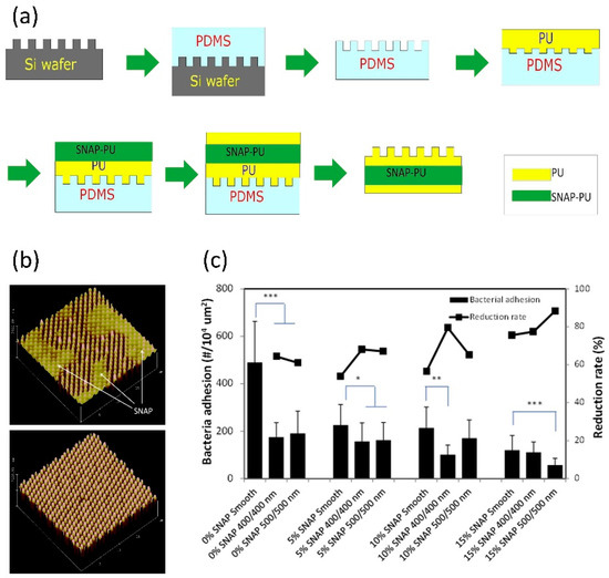 (a) The preparation of SNAP-doped textured PU surface using soft lithography two-stage replication molding technique. (b) 3D atomic force microscope (AFM) images of NO releasing textured polyurethane film surface, in which thin top layer showing the diffusion of SNAP onto top surface (above), and thick top layer showing normal textured surface feature (below). (c) Bacterial adhesion and reduction rates (against smooth regular PU polymer) on NO releasing textured polyurethane surfaces, in which asterisks represent a statistically significant difference in bacterial adhesion relative to non-textured surface, with * denotin p < 0.05, ** denoting p < 0.01, and *** denoting p < 0.001. Reproduced with permission from [157]. Copyright 2017, Elsevier.