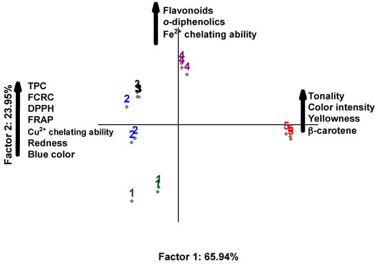 Principal component analysis based on physicochemical properties and antioxidant activity of marigold flower extracts (Calendula officinalis L.). Extract 1 = 100% H2O:0% EtOH; extract 2 = 75% H2O:25% EtOH; extract 3 = 50% H2O:50% EtOH; extract 4 = 25% H2O:75% EtOH; and extract 5 = 0% H2O:100% EtOH. TPC = total phenolic content; FCRC = Folin–Ciocalteau reducing capacity.