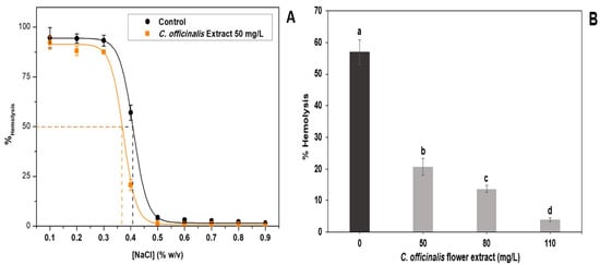 In vitro antihemolytic effect of lyophilized marigold extract (C. officinalis). (A) Effects on hemolysis of human erythrocytes at different concentrations of NaCl; (B) effects of different extract concentrations on hemolysis of human erythrocytes at 0.3% (w/v) NaCl. Different letters (a–d) represent statistically significant differences, p < 0.0001 (B).