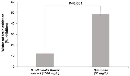 LME showed 12% inhibition of lipid oxidation of Wistar rat brains at a concentration of 1000 mg/L, statistically differing (p < 0.001) from quercetin inhibition capacity (50 mg/L) (Figure 3). The superiority of quercetin was already expected since it is a standard of high purity and with a recognized ability to inhibit lipid oxidation. However, the inhibitory capacity presented by the LME is an essential feature because it shows that it is active in biological media inhibiting the oxidation of brain tissue lipids. This test shows the ability of the compounds present in the extract to transfer H+ atom to free radicals generated by lipid-induced oxidation [50]. The ability of C. officinalis extracts to inhibit lipid oxidation was also observed in an in vivo study by Tanideh et al. [51]. The same authors found that the hydroalcoholic extract (EtOH:H2O, 80:20 v/v) of C. officinalis flowers, administered orally to male Sprague–Dawley rats, showed decreased lipid oxidation.