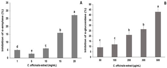 In vitro inhibitory effects of different concentrations of lyophilized marigold extract (C. officinalis) on the activities of α-amylase (A) and α-glucosidase (B) enzymes. Different letters (a–e) represent statistically significant differences (p < 0.0001).