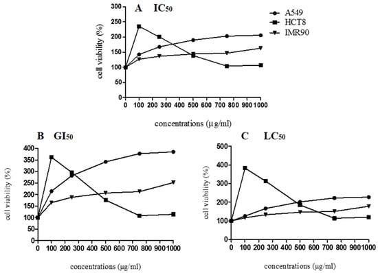 Cell viability of A549, HCT8, and IMR90 cells in relation to different concentrations of lyophilized marigold extract (C. officinalis). (A) IC50: The concentration of the agent that inhibits growth by 50% is the concentration at which (T/C) × 100 = 50, where T = number of cells, at time t of treatment; C = control cells at time t of treatment. (B) GI50: The concentration of the agent that inhibits growth by 50%, relative to untreated cells, is the concentration at which ([T−T0]/[C−[]T0]) × 100 = 50, where T and C are the number of treated and control cells, respectively, at time t of treatment and T > T0; T0 is the number of cells at time zero. (C) LC50: The concentration of the agent that results in a net loss of 50% cells, relative to the number at the start of treatment, is the concentration at which ([T−T0]/T0) × 100 = −50; T < T0.