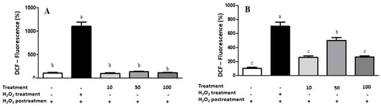 Results of intracellular ROS measurement in A549 (A) and IMR90 (B) cells by spectrofluoremetry. Treatment = lyophilized marigold extract (C. officinalis) at 10–100 μg/mL. Quantitative data are the mean ± standard deviation. Different letters (a–c) comparing the treatments indicate significant differences (p < 0.05).
