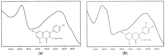 Examples of Flavonoid structures found in bee pollen (BP) and bee bread (BB), from [53] (with permission of the authors). Structure (a): Kaempferol-3-O-[rhamnosyl (1-2) glucoside] (RT (retention time) = 33.2; λmax = 265, 290 sh, 320 sh, 350 nm); (b): Quercetin-3-O-[glucosyl (1-2) glucoside] (RT = 30.6; λmax = 255, 266 sh, 294 sh, 355 nm).