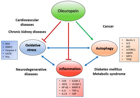 Effect of oleuropein on interplay between oxidative stress, autophaghy and inflammation in non-communicable diseases. AMPK, 5’ adenosine monophosphate-activated protein kinase; Beclin-1 autophagy-specific marker; COX, Cyclooxygenase; CRP, C Reactive Protein; Hcy, homocysteine; ICAM-1, Intercellular Adhesion Molecule 1; IL-1β, interleukin-1β; IL-6, interleukin-6; iNOS, inducible form of nitric oxide synthase; LC3 autophagy-specific marker; MMP-9, metalloproteinases-9; mTOR, mammalian target of rapamycin; NF-kB, Nuclear Factor Kappa-Light-Chain-Enhancer of Activated B Cells; oxLDL, oxidized low-density lipoprotein; p62 autophagy-specific marker; PARP1, Poly (ADP-ribose) polymerase; ROS, Reactive Oxygen Species; SIRT-1, NAD-dependent deacetylase sirtuin-1; TFEB, Transcription factor EB; TNF-α, tumour necrosis factor-α; VCAM-1, Vascular Cell Adhesion Molecule 1.