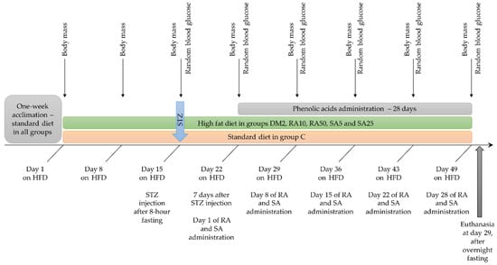 Timeline of the in vivo part of the experiment. HFD: high-fat diet; STZ: streptozotocin; RA: rosmarinic acid; SA: sinapic acid; C: control rats; DM2: HFD + STZ-induced type 2 diabetic rats; RA10 and RA50: HFD + STZ-induced diabetic rats treated with rosmarinic acid at a dose of 10 mg/kg and 50 mg/kg, respectively; SA5 and SA25: HFD + STZ-induced diabetic rats treated with sinapic acid at a dose of 5 mg/kg and 25 mg/kg, respectively, for 28 days.