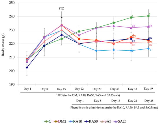 Effect of rosmarinic acid and sinapic acid on the body mass of the HFD + STZ-induced type 2 diabetic rats. The results presented as mean ± SEM were evaluated by one-way ANOVA followed by the LSD post-hoc test (statistically significant if p < 0.05). Values which have the same superscript letter(s) in each time point are not significantly different. When no letters are present in the superscript the ANOVA test was not significant. C: control rats; DM2: HFD + STZ-induced diabetic rats; RA10 and RA50: HFD + STZ-induced diabetic rats treated with rosmarinic acid at a dose of 10 mg/kg and 50 mg/kg, respectively; SA5 and SA25: HFD + STZ-induced diabetic rats treated with sinapic acid at a dose of 5 mg/kg and 25 mg/kg, respectively, for 28 days; HFD: high-fat diet; STZ: streptozotocin.