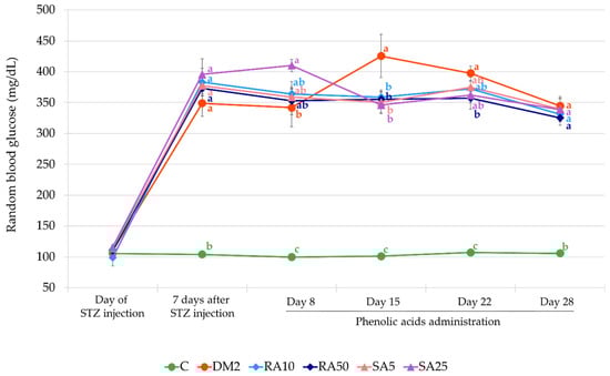 Effect of rosmarinic acid and sinapic acid on the random blood glucose level of the HFD + STZ-induced type 2 diabetic rats. The results presented as mean ± SEM were evaluated by one-way ANOVA followed by LSD post-hoc test (statistically significant if p < 0.05). Values which have the same superscript letter(s) in each time point are not significantly different. When no letters are present in the superscript, the ANOVA test was not significant. C: control rats; DM2: HFD + STZ-induced diabetic rats; RA10 and RA50: HFD + STZ-induced diabetic rats treated with rosmarinic acid at a dose of 10 mg/kg and 50 mg/kg, respectively; SA5 and SA25: HFD + STZ-induced diabetic rats treated with sinapic acid at a dose of 5 mg/kg and 25 mg/kg, respectively, for 28 days; HFD: high-fat diet; STZ: streptozotocin.
