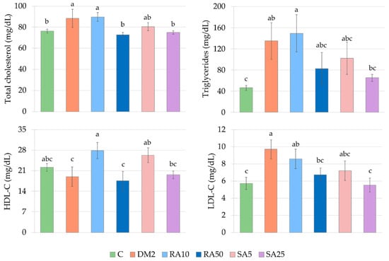 Effect of rosmarinic acid and sinapic acid on the lipid profile in the serum of the HFD + STZ-induced type 2 diabetic rats. The results presented as mean ± SEM were evaluated by one-way ANOVA followed by LSD post-hoc test (statistically significant if p < 0.05). Values which have the same superscript letter(s) in each graph are not significantly different. When no letters are present in the superscript, the ANOVA test was not significant. C: control rats; DM2: HFD + STZ-induced diabetic rats; RA10 and RA50: HFD + STZ-induced diabetic rats treated with rosmarinic acid at a dose of 10 mg/kg and 50 mg/kg, respectively; SA5 and SA25: HFD + STZ-induced diabetic rats treated with sinapic acid at a dose of 5 mg/kg and 25 mg/kg, respectively, for 28 days; HFD: high-fat diet; STZ: streptozotocin; HDL-C: high-density lipoprotein cholesterol; LDL-C: low-density lipoprotein cholesterol.