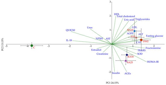 Principal component analysis (PCA) biplot of parameters obtained from the serum. Symbols and red fonts indicate means for individual experimental groups (whiskers represent SEM). ●—Control groups: green—untreated control rats (C); red—HFD + STZ control rats (DM2). ◆—Rosmarinic acid-treated HFD + STZ rats: light blue—10 mg/kg (RA10), navy blue – 50 mg/kg (RA50). ▲—Sinapic acid-treated HFD + STZ rats: pink—5 mg/kg (SA5), purple—25 mg/kg (SA25). Blue fonts and green lines show correlations of measured parameters with regard to experimental groups in the PCA plot (autoscaled). AST: aspartate aminotransferase; IL-18: interleukin-18.