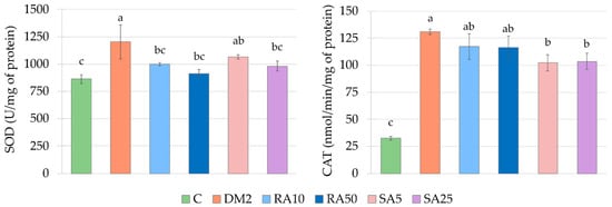 Effect of rosmarinic acid and sinapic acid on the antioxidative enzymes activities and non-enzymatic antioxidants level in the cardiac tissue of the HFD + STZ-induced type 2 diabetic rats. The results presented as mean ± SEM were evaluated by one-way ANOVA followed by LSD post-hoc test (statistically significant if p < 0.05). Values which have the same superscript letter(s) in each graph are not significantly different. If there are no letters in superscript, the ANOVA test was not significant. C: control rats; DM2: HFD + STZ-induced diabetic rats; RA10 and RA50: HFD + STZ-induced diabetic rats treated with rosmarinic acid at a dose of 10 mg/kg and 50 mg/kg, respectively; SA5 and SA25: HFD + STZ-induced diabetic rats treated with sinapic acid at a dose of 5 mg/kg and 25 mg/kg, respectively, for 28 days; HFD: high-fat diet; STZ: streptozotocin; SOD: superoxide dismutase; CAT: catalase.