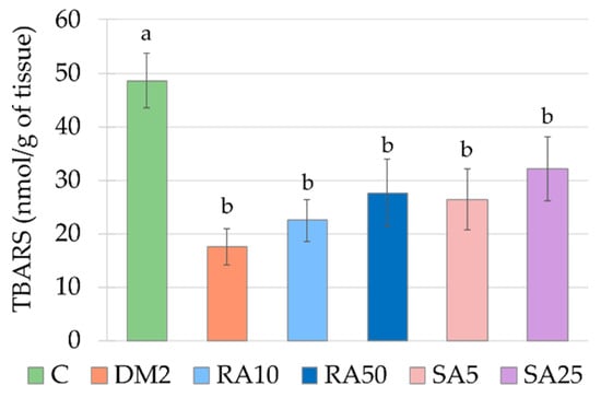 Effect of rosmarinic acid and sinapic acid on the oxidative damage markers level in the cardiac tissue of the HFD + STZ-induced type 2 diabetic rats. The results presented as mean ± SEM were evaluated by one−way ANOVA followed by LSD post-hoc test (statistically significant if p < 0.05). Values which have the same superscript letter(s) in each graph are not significantly different. When no letters are present in the superscript, the ANOVA test was not significant. C: control rats; DM2: HFD + STZ-induced diabetic rats; RA10 and RA50: HFD + STZ-induced diabetic rats treated with rosmarinic acid at a dose of 10 mg/kg and 50 mg/kg, respectively; SA5 and SA25: HFD + STZ-induced diabetic rats treated with sinapic acid at a dose of 5 mg/kg and 25 mg/kg, respectively, for 28 days; HFD: high-fat diet; STZ: streptozotocin; TBARS: thiobarbituric acid reactive substances.