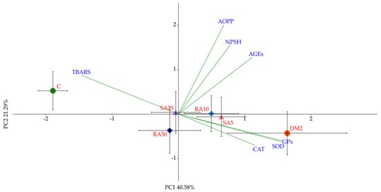 Similarly to the results obtained from the serum, the PCA from the cardiac tissue showed a distinct separation of experimental groups across PC1, accounting for more than 40% of observed variation. The C and DM2 groups represented the two extremes, with C located all the way to the left, and DM2 all the way to the to the right of the aforementioned axis. The SA5 and RA10 groups clustered slightly to the right, closer to the DM2 group, whereas the SA25 and RA50 groups clustered near the center of the PC1 axis, with a slight shift towards the C group. However, it must be noted that although both clusters were located between the C and the DM2, only the separation of the latter one, RA50-SA25, can be considered significant with regard to both the C and DM2 (p < 0.001, LSD). The variation observed across PC1 was predominantly determined by the GPx, SOD, and CAT variables, correlating with the right portion of the plot, notably the DM2 group, as well as TBARS, which in turn correlated with the left portion of the plot and the C group. The separation across the PC2 was negligible as it did not produce any statistically significant differences between the groups (Figure 8).