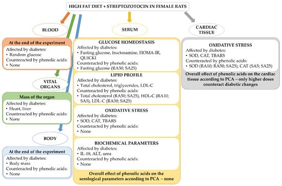 Figure 9 outlines the main significant results obtained during the study—the effect of diabetes induced by HFD + STZ and the effect of the phenolic acids on the diabetes-induced changes.