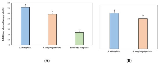 S. rhizophila and B. amyloliquefaciens inhibited the mycelial growth of C. gloeosporioides significantly through VOCs (Figure 1B). The greatest growth inhibition (65%) of the phytopathogen fungus was achieved by the marine bacteria S. rhizophila.