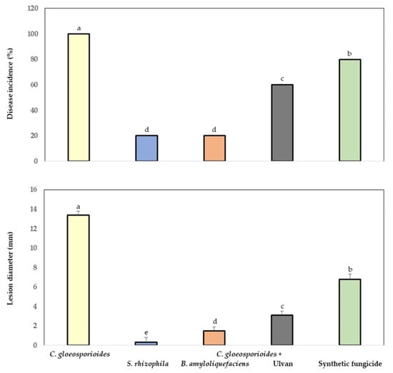 Incidence and lesion diameter caused by Colletotrichum gloeosporioides in fruit treated with marine bacteria, ulvan, and synthetic fungicide. Data are presented as a mean ± SD (n = 10). The columns with different letters were significantly different according to Tukey’s test (p < 0.05).