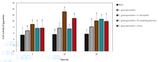 Catalase (CAT) activity in papaya fruit inoculated with Colletotrichum gloeosporioides, marine bacteria, and ulvan. Data are presented as a mean ± SD (n = 10). Columns with different letters were significantly different according to Tukey’s test (p < 0.05).