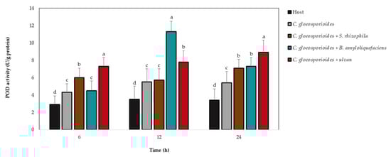 Peroxidase (POD) activity in papaya fruit inoculated with Colletotrichum gloeosporioides, marine bacteria, and ulvan. Data are presented as a mean ± SD (n = 10). Columns with different letters were significantly different according to Tukey’s test (p < 0.05).