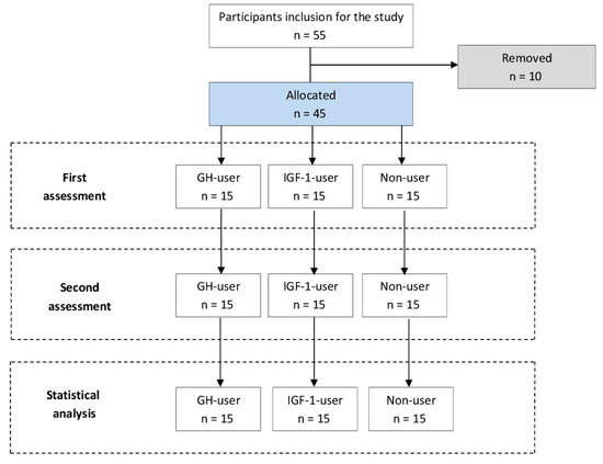Initially, 55 male bodybuilders from local gyms volunteered to participate in the study. To be included in the study, participants were required to complete all measurements and have inclusion criteria to the study. As a result of these requirements, 10 subjects were removed from the study. Therefore, 45 male bodybuilders were included in the study and were allocated into 3 groups: bodybuilders using growth hormone for at least 1 year (GH-user, n = 15), bodybuilders using insulin-like growth factor-1 for at least 1 year (IGF-1-user, n = 15), and peptide hormone-free bodybuilders (Non-user, n = 15) (Table 1). The male bodybuilders fulfilled the following inclusion criteria: (a) between 25 and 40 years old, (b) at least 3 years’ experience in resistance training program for three to five training sessions per week, (c) no background in lower and upper body injuries, or musculoskeletal disorders and surgery, (d) no background in cardiovascular, metabolic and respiratory diseases which was checked by a physician (Figure 1). The peptide hormone-using groups were self-administrating GH or IGF-1 in a cyclic fashion (three to ten mcg daily, three to four times during the one year with two months of washout between periods). Institutional review board approval (IAU-9031397) for our study was obtained by Islamic Azad university, and the participants were informed about procedures of the study and advantages or possible hazards which are associated following the participation to the study, and each subject signed an informed consent form before participation in the study.