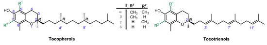 Vitamin E is one of the most effective natural lipophilic chain-breaking antioxidants, which exhibits also a broad spectrum of other biological functions. Due to lipophilic properties vitamin E incorporates into biological membranes and protects them from oxidative damage. Moreover, it regulates the structural and functional properties of cell membranes, giving them adequate fluidity, stability, and permeability. The term “vitamin E” is a collective name of eight naturally occurring compounds with similar structures, called tocochromanols. The vitamin E family includes four tocopherols with a saturated phytyl side-chain and four tocotrienols with a side-chain with three double bonds at the 3’, 7’, and 11’ positions (farnesyl chain). Both groups consist of four forms: α-, β-, γ-, and δ-, differing in location and number of methyl groups on the aromatic ring (Figure 1). α-Tocopherol (α-T) shows the highest antioxidant activity [,,].