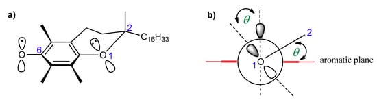 According to Ingold and Burton, the high antioxidant activity of vitamin E should be attributed to the high reactivity of the phenolic group at the C-6 position, which is caused by resonance stabilization from the stereoelectronic effects of the respective chromanyloxyl radicals formed [,,]. The dihydropyranyl ring has a half-chair conformation and forces almost perpendicular orientation of the 2p-type orbital of the oxygen atom in position 1 to the aromatic ring plane (angle θ approx. 16°, Figure 3). Electron delocalization induces a strong overlap between the 2p-type orbital on the O1 atom and the aromatic π-electron system. The smaller the angle θ between the p-orbital and the axis perpendicular to the plane of the aromatic ring, the greater the overlap of the orbitals, and thus, the lower the binding strength of the O–H phenolic group, and therefore the higher the activity of a phenolic antioxidant [,,,,]. Ingold and Burton estimated the antioxidant activity of tocopherols and selected phenols based on the rate of inhibition of styrene autoxidation (kinh). The results are listed in Table 1. They concluded that high chain-breaking activity arises mainly from the aforementioned stereoelectronic effects exerted by 2p-type lone pair of electrons of the heterocyclic oxygen atom O1 situated in the para position to the phenolic group, which is able to stabilize the incipient phenoxyl radical. Additional factors include the electron-donating methyl substituents on the aromatic ring. β-, γ-, and δ-Tocopherols show a lower kinh than fully methylated α-T. Nevertheless, the electron-donating or electron-withdrawing substituents found at C-2 and adjacent to the O1 atom increase or decrease antiradical properties, respectively. Thus, carboxyl group reduces the contribution of non-binding electron pairs of the heterocyclic oxygen atom in the stabilization of phenoxyl radicals. Trolox (1a) shows less antioxidant activity than Trolox methyl ester (1b), 2,2,5,7,8-pentamethylchroman-6-ol (PMHC; 1c), and α-tocopherol (Table 1) []. Reduction of the heterocyclic ring size to five-membered in benzofuran analog 2d caused flattening of the heterocyclic ring and a more perpendicular orientation (θ approx. 6°) of the oxygen 2p-type orbital, which resulted in a significant increase in antioxidant activity compared to α-T (about 1.5 times) [].