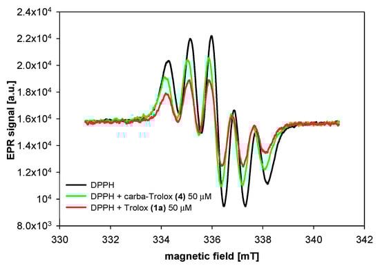 EPR spectra of DPPH radical in the absence (control) and presence of Trolox (1a) and carba-Trolox (4).