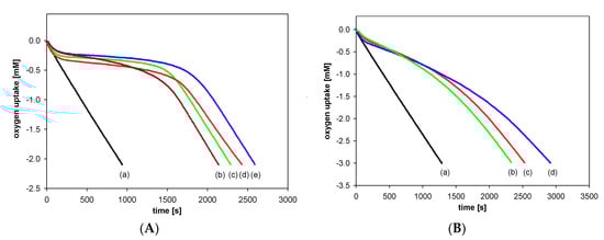 Antioxidant activity of the synthesized compounds was evaluated based on the rate constant (kinh) for the reaction with alkyl peroxyl radicals (ROO●) during the controlled inhibited autoxidation of styrene. Figure 7 displays the oxygen consumption during the autoxidation of styrene in the presence of chroman-6-ols (A) and the respective 1-carba-analogs (B). These plots indicate that the oxygen consumption is strongly inhibited by α-T (blue line) during the initial reaction period, then, when the antioxidant has been completely consumed, the slope of the oxygen uptake trace increases, becoming identical to that observed when the process is uninhibited.