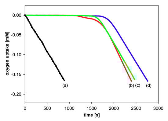 All experiments were performed by measuring the oxygen pressure changes in the two-channel gas uptake apparatus based on an ultra-precise differential pressure sensor (pressure transducer) described elsewhere [,]. Progress of oxidation was monitored by the measurement of the oxygen pressure difference between the reference (total solution volume ~4 mL) and sample flask (total solution volume ~4 mL)—in the sample flask, the oxygen was consumed in the presence of investigated compound (20 μL of 1–2 mM antioxidant solution in acetonitrile was added), in contrast to the reference flask with high concentration (250 μM) of PMHC (1c) in order to completely inhibit the oxidation process. Basing on oxygen consumption plots (Δ[O2]) with time, for each of the tested compounds, the values of the induction period, τ [s], were graphically determined (linear regression method), as is presented in Figure 5. The values of inhibition rate constant kinh [M−1s−1] and the stoichiometric factor n (e.g., the number of peroxyl radicals trapped by a molecule of an antioxidant) were calculated according to the following equations: