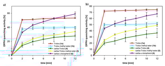 Amount of DPPH radical quenched by tested compounds 1a (Trolox), 1b (Trolox methyl ester), 4 (carba-Trolox), 5 (carba-Trolox methyl ester), and 6 (carba-α-tocopherol) in concentrations: (a) 50 μM; (b) 75 μM.