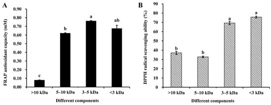 Ferric-reducing antioxidant power (FRAP) (A) and the 2,2-diphenyl-1-picrylhydrazyl (DPPH) radical scavenging ability (B) of peptide fractions obtained by ultrafiltration. The concentration of the sample is 5 mg/mL. Different letters(a–c) indicate significant differences among treatments for α = 0.05. Means ± SD (n = 3).