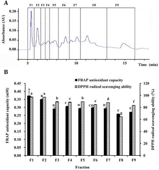 (A) Elution diagram of sheep plasma protein hydrolysate with molecular weights <5 kDa by semi-preparation reverse-phase high-performance liquid chromatography (RP-HPLC). (B) Ferric-reducing antioxidant power (FRAP) and the 2,2-diphenyl-1-picrylhydrazyl (DPPH) radical scavenging ability of the fractions (F1–F9) purified by semi-preparation RP-HPLC. The concentration of the sample is 100 μg/mL. Different letters (A–F, a–g) in the same column indicate significant difference among treatments for α = 0.05. Means ± SD (n = 3).