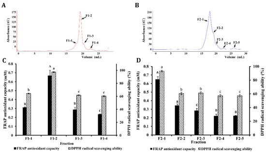 Elution diagram of the F1 (A) and F2 (B) fractions by AKTA protein rapid separation system. Ferric-reducing antioxidant power (FRAP) and the 2,2-diphenyl-1-picrylhydrazyl (DPPH) radical scavenging ability of the separations of the F1 fraction (C) and F2 fraction (D). The concentration of the sample is 100 μg/mL. Different letters (A–D, a–c) in the same column indicate significant difference among treatments for α = 0.05. Means ± SD (n = 3).