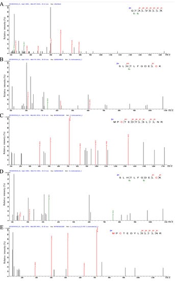 The amino acid sequence of antioxidative peptide identified from F1-2 fraction (A–C) and F2-1 fraction (D,E). (A) A peptide with the sequence of QTALVELLK was identified from ion m/z 507.81. (B) A peptide with the sequence of SLHTLFGDELCK was identified from ion m/z 710.35. (C) A peptide with the sequence of MPCTEDYLSLILNR was identified from ion m/z 862.92. (D) A peptide with the sequence of SLHTLFGDELCK was identified from ion m/z 710.35. (E) A peptide with the sequence of MPCTEDYLSLILNR was identified from ion m/z 580.95.