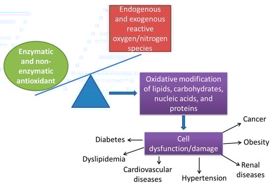 Oxidative stress occurs when there is an imbalance between the production of free radical species and the antioxidant ability to neutralize their harmful effects []. Free radicals can be defined as highly reactive molecular species (atoms or molecules) that contain one or more unpaired electrons in their external shell or outer orbit and that are capable of independent existence []. In cells, these radicals can act as oxidants or reductants by losing or accepting a single electron, and they are continuously produced by the organism’s normal use of oxygen []. Free radicals include reactive radical and nonradical derivatives of oxygen (ROS) and nitrogen (RNS) that are collectively called reactive oxygen nitrogen species (RONS) []. The generation of RONS is a physiological process and, at moderate or low levels, RONS are important molecules involved in a number of cellular signaling pathways, in the extraction of energy from organic molecules, in immune defense, in mitogenic response, and in redox regulation []. An excess production or a decreased scavenging of RONS has been implicated in aging and age-related diseases []. Both endogenous and exogenous sources of RONS have been described. The endogenous sources of RONS include different subcellular organelles, such as mitochondria, peroxisomes, and endoplasmic reticulum, where oxygen consumption is high []. NADPH oxidase (nicotinamide adenine dinucleotide phosphate oxidase) is a prevalent source of the superoxide radical (•O2−), which is formed by the addition of one electron leak from the electron transport system during cellular respiration to the molecular oxygen. Most of the superoxide dismutates into hydrogen peroxide (H2O2) through superoxide dismutase (SOD) []. H2O2 is a neutral molecule because it has no unpaired electrons, but it is able to form the most reactive and dangerous radical, the hydroxyl radical (•OH), through a Fenton or Haber–Weiss reaction. Hydroxyl radicals mainly react with phospholipids in cell membranes and proteins. In activated neutrophils, in the presence of chloride and myeloperoxidase, H2O2 can be converted into hypochlorous acid that can react with DNA and produce pyrimidine oxidation products and add chloride to DNA bases []. Another important determinant in the cellular redox equilibrium is nitric oxide (NO). In mammals, NO can be generated by three main isoforms of nitric oxide synthase (NOS): endothelial NOS, which is related to vasodilation and vascular regulation; neuronal NOS, which is linked to cellular signaling; and inducible NOS, which is activated in response to various endotoxin or cytokine signals []. All isoforms of NOS utilize arginine as the substrate and molecular oxygen and reduced nicotinamide–adenine–dinucleotide phosphate (NADPH) as cosubstrates. The reaction of NO with the superoxide radical (•O2−), forms the potent oxidant peroxynitrite (ONOO−). This compound can cause oxidative damage, nitration, and the S-nitrosylation of biomolecules, including proteins, lipids, and DNA []. Nitrosative stress through ONOO− has been implicated in DNA single-strand breakage, followed by poly-ADP-ribose polymerase (PARP) activation []. Exogenous sources of RONS are numerous and include air and water pollution, pesticides, tobacco, alcohol, heavy metals (Fe, Cu, Co, and Cr) or transition metals (Cd, Hg, Pb, and As), drugs (cyclosporine, tacrolimus, gentamycin, and bleomycin), industrial solvents, cooking (smoked meat, waste oil, and fat), and radiation. Inside the body, all of these substances are metabolized into free radicals []. Endogenous or exogenous RONS are capable of damaging biologically relevant molecules with consequent cell damage and homeostatic disruption []. Among them, lipids, carbohydrates, nucleic acids, and proteins are the major targets, and their oxidative modification can also be used as markers of oxidative stress [].