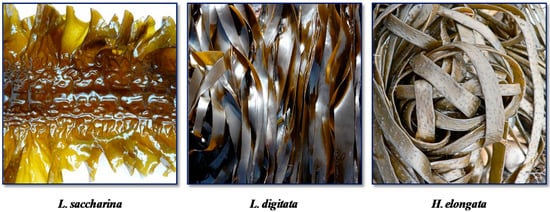 Irish brown seaweeds (Figure 1) used in this study namely, Laminaria digitata, Laminaria saccharina and Himanthalia elongata (Phaeophyta) were purchased from Quality Sea Veg., Co Donegal, Ireland. Among the tested seaweeds, L. digitata and L. saccharina (also known as Saccharina latissima) are large conspicuous dark brown and yellow brown kelp, commonly found down to a maximum depth of 20 m and 30 m in clear waters respectively. The stipes of L. digitata are smooth, flexible and oval in cross section while L. saccharina has a long undivided frond with a distinct bullations and a distinctive frilly undulating margin. Both are usually found attached to bedrock or other suitable hard substrata in the low water in Intertidal pools and occasionally in the shallow subtidal zones. H. elongata is a light yellow-brown fucoid species which has long, narrow, strap-like branched fronds with basal mushroom-like buttons. It is found attached to rocks or hard substrata on moderately semi-wave-exposed shore. Seaweed species were harvested and collected in winter (January/February), washed thoroughly with fresh water to remove epiphytes, eliminate salt, sand or shells and stored at −20 °C until analysis.