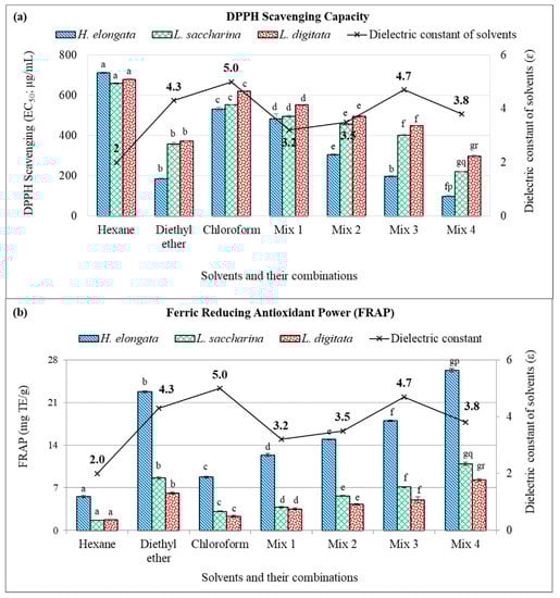 : L. digitata]. Data are expressed as mean ± SD (n = 6). Ferric Reducing Antioxidant Power (FRAP) values are expressed as mg Trolox equivalent (TE)/g extract (dry weight). Letters (a–g) on each bar are significantly different (p < 0.05) for various solvents, for each individual species. Letters (p–r) on bars at a specific solvent (Mix 4) are significantly different (p < 0.05) among the three species. Mix 1: n-hexane and diethyl ether; Mix 2: n-hexane and chloroform; Mix 3: diethyl ether and chloroform; Mix 4; n-hexane, diethyl ether and chloroform. All the solvents were mixed either 1:1 or 1:1:1 ratio (v/v).
