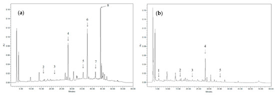 Chromatograms of grape stem extracts displayed at 324 nm: (a) obtained after incubation in 50% ethanol at 40 °C for 24 h (solid/solvent ratio 1:100); (b) obtained after incubation in water at 25 °C for 24 h (solid/solvent ratio 1:100). 1: Gallic acid; 2: Catechin; 3: Malvidin-3-glucoside; 4: Quercetin derivative; 5: Anthocyanin; 6: Resveratrol; 7: Quercetin; and 8: Viniferin.