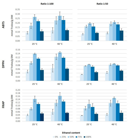 According to the antioxidant capacity results, it would seem that both the ethanol concentration in the medium as well as the ratio solid/solvent have an influence on the extraction of antioxidant compounds from grape stems (Figure 2). The highest values of antioxidant capacity were obtained for the extracts obtained using 50% of ethanol and a 1:100 ratio, independently of the assay used. As for the temperature, it seems that an increase of temperature tends to generate higher values of antioxidant capacity. Moreover, it is noticeable that the highest values of antioxidant capacity were obtained by the ABTS method. The behavior pattern of antioxidant capacity obtained for the different extracts was similar through either ABTS, DPPH, or FRAP. However, the absolute value obtained by the ABTS assay was almost two-fold higher than the values obtained by the other two methods, which coincides with the results from Barros et al. [16]. On the other hand, the values of antioxidant capacity obtained in our extracts from Mazuelo grape stems were lower than those obtained by Barros et al. [16] from different Portuguese grape stems varieties. These authors found values of antioxidant capacity, between 30 and 70 mmol Trolox/100 g DM by ABTS assay and between 20 and 45 mmol Trolox/100 g DM when they used DPPH and FRAP methods.