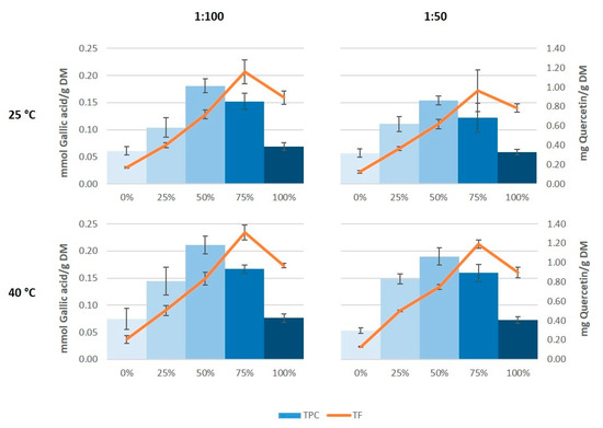 Among the 20 extractions obtained, the extraction yields ranged between 14.6% (25 °C, ratio 1:50, 100% ethanol) to 37.6% (40 °C, 1:100, 75% ethanol). However, it is important to point out that these values are not directly related to the phenolic composition of the samples or to their antioxidant activity. This is because in the extracts, there could be different compounds with antioxidant capacity apart from polyphenols, as well as polyphenols or other compounds with a scant or null antioxidant activity.