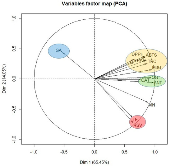 Principal component analysis of all the variables assayed: ABTS, DPPH, FRAP, TPC, total flavonoid content (TF), gallic acid (GA), catechin (CAT), quercetin (Q), quercetin-3-glucoside (QG), malvidin-3-glucoside (M3G), unknown anthocyanin (ANT), resveratrol (RSV), and viniferin (VIN).