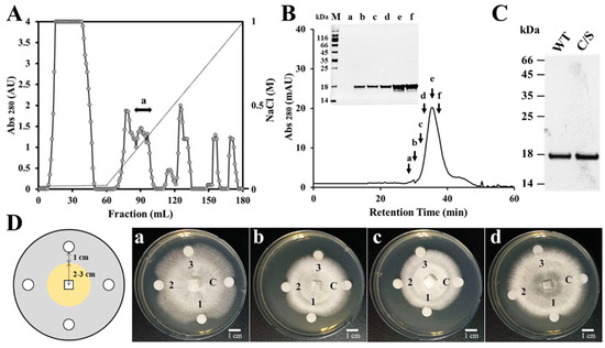 Isolation of a rice antifungal protein and growth inhibition of OsTrxm variant proteins. (A) The fraction unbounded in CM sepharose column was executed under DEAE sepharose column, which resulted in purification of OsTrxm in the indicated fraction (a). Dotted line presents a linear gradient of NaCl. (B) Fraction with antifungal activity was loaded on Superdex 200 column at 0.6 mL/min for 60 min and the indicated fractions were ascertained in a SDS-PAGE (inset figure) M: size marker; a–f: FPLC fractions. (C) Recombinant OsTrxm (WT) and OsTrxm C/S (C/S) proteins were purified by using Ni-NTA and Superdex 200 columns. (D) Growth inhibition of OsTrxm and its mutant protein in solid cultures of Trichoderma harzianum (a), Fusarium moniliforme (b), Penicillium verrucosum (c), and T. viride (d). C: control; 1: OsTrxm C/S; 2: histatin 5; 3: OsTrxm, a scheme of radial growth inhibition assay (left panel).