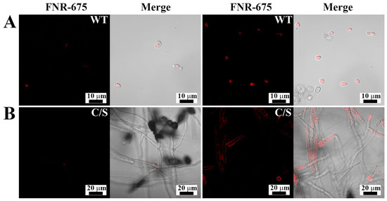 Cellular distributions of FNR-675-labeled OsTrxm proteins in Candida albicans (A) and F. solani (B) cells. The cells were treated with OsTrxm variants (WT: OsTrxm and C/S: OsTrxm C/S) at their IC50 concentration.