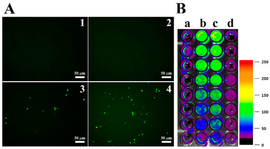 ROS generation by OsTrxm proteins in C. albicans. (A) Cells were treated with OsTrxm proteins at the IC50 concentration for 12 h, and they were stained with 0.5 μM DCF-DA for 30 min. 1: control; 2: melittin; 3: OsTrxm; 4: OsTrxm C/S. (B) Merged 96-well plate between bright image and fluorescent levels of DCF in C. albicans cells. a: control; b: OsTrxm; c: OsTrxm C/S; d: melittin.