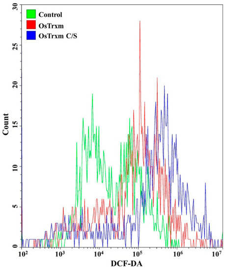 The ROS level in Aspergillus flavus was analyzed using FACS with DCF-DA staining after OsTrxm and OsTrxm C/S mutant protein (64 μg/mL and 7 μg/mL, respectively) treatment.