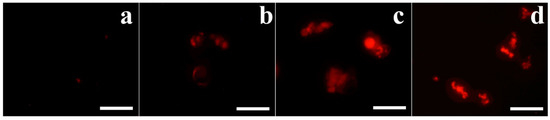 Mitochondrial superoxide (SOX) generation of OsTrxm proteins in A. flavus cells. Cells exposed with proteins at IC50 concentration for 8 h were stained with MitoSOX Red and observed by using fluorescence microscope. (a): control; (b): histatin 5; (c): OsTrxm; (d): OsTrxm C/S. Scale bar: 10 μm.