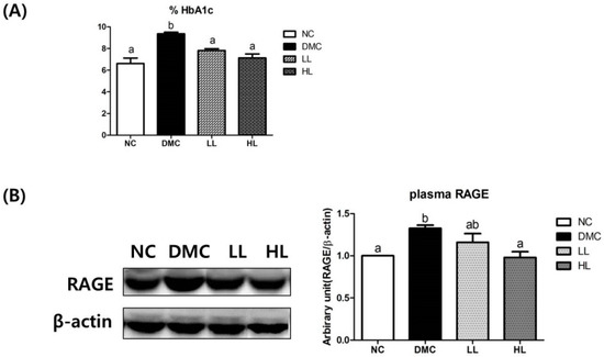 Effects of LBE supplementation on glycation products in T2DM mice. (A) %HbA1c and (B) plasma advanced glycation end products receptor (RAGE). Values are means ± SEM (n = 6). Mean values with different letters (a and b) were significantly different. (p < 0.05). NC: non-diabetic control group; DMC: diabetes mellitus control; LL: low dosage of LBE; HL: high dosage of LBE.