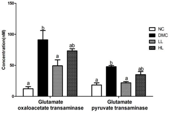 Plasma GOT and GPT levels were measured as biomarkers of liver injury. GOT and GPT levels were significantly higher in the DMC group than those in the NC group. Low dosage of LBE supplementation significantly lowered GOT and GPT levels compared to the DMC group whereas a high dosage of LBE supplementation did not (Figure 2).