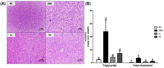 Figure 3A shows the hepatic histology in each group. The white area estimated by fat deposition in the liver was increased in the DMC group compared to that in the NC group. However, in particular, the LL group showed a decrease in white areas compared to the DMC group. These findings could represent less fat deposition after the LBE treatment.