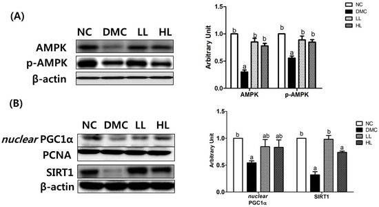 The protein levels of energy metabolism related markers including AMPK, p-AMPK, nuclear PGC1α, and SIRT1 were measured. The protein levels of AMPK, P-AMPK, nuclear PGC1α, and SIRT1 were decreased in the DMC group compared to those in the NC group. However, the protein levels of AMPK and p-AMPK in the LB treatment groups were significantly higher compared to those in the DMC group. The LL group showed a significantly higher level of SIRT1 than that in the DMC group. However, the protein level of PGC1α was not normalized by LBE supplementation (Figure 5).